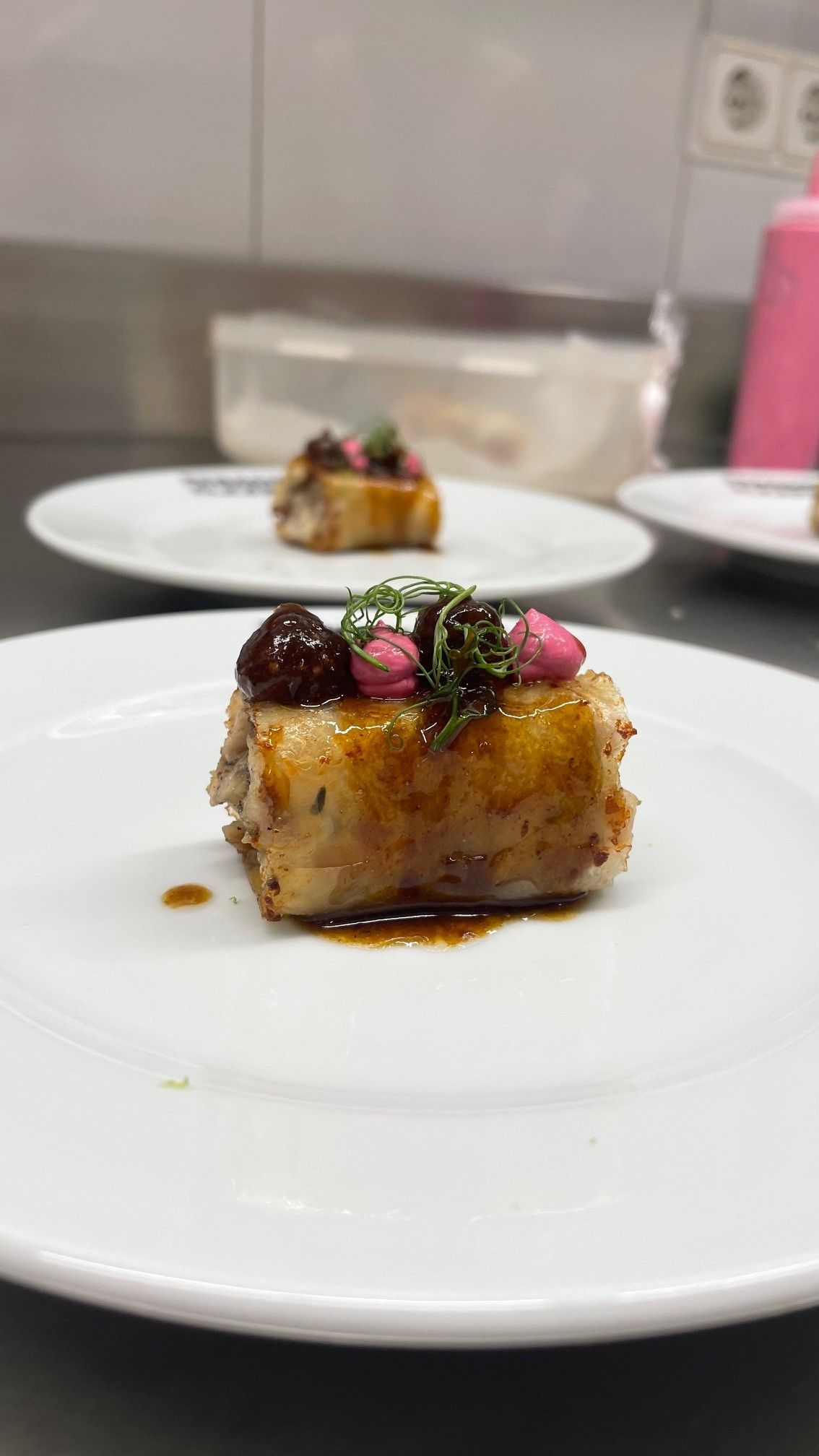 La creación vencedora, elaborada por el cocinero Ibán Garín, es un homenaje al recetario histórico de la localidad navarra. Un canutillo crujiente relleno de papada ibérica ahumada y conejo a la brasa, acompañado de duxelle de seta portobello y trufa, chutney de higo negro con especias silvestres, cremoso de remolacha y toques cítricos son los deliciosos ingredientes de esta joya culinaria en miniatura. Todo ello, respetando la exigencia del certamen de utilizar únicamente productos previos al descubrimiento de América, lo que fomenta la originalidad y la creatividad de los hosteleros participantes.
