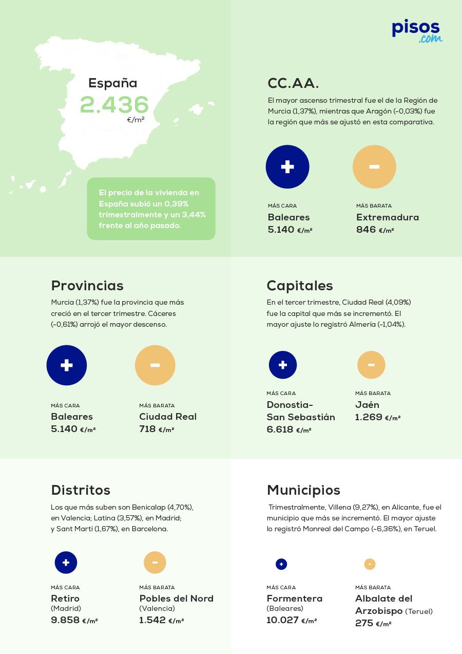 Las mayores subidas trimestrales se dieron en Villena (9,27%), en Alicante; Andorra (9,24%), en Teruel; y Covaleda (9,19%), en Soria. Las que más bajaron fueron Monreal del Campo (-6,36%), en Teruel; Allariz (-5,45%), en Ourense; y El Casar (-5,12%), en Guadalajara. Los que más crecieron de un año a otro fueron Sóller (32,58%), en Baleares; Andratx (32,19%), en Baleares; y Oñati (32,10%), en Guipúzcoa. Los que más vieron decrecer su precio medio fueron Allariz (-25,71%), en Ourense; Pedro Muñoz (-25,48%), en Ciudad Real; y Celanova (-24,64%), en Ourense. El municipio más caro fue Formentera (10.027 €/m²), en Baleares, y el más barato, Albalate del Arzobispo (275 €/m²), en Teruel.
