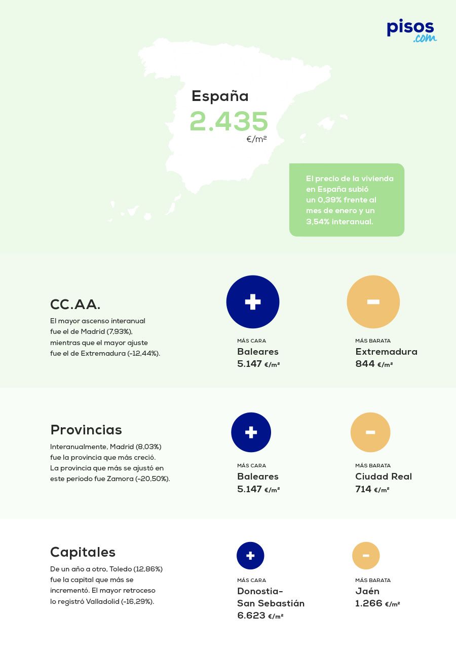 Según pisos.com la vivienda de segunda mano en España tuvo un precio medio de 2.435 euros por metro cuadrado en el mes de febrero de 2026, subiendo un 0,39% frente a enero